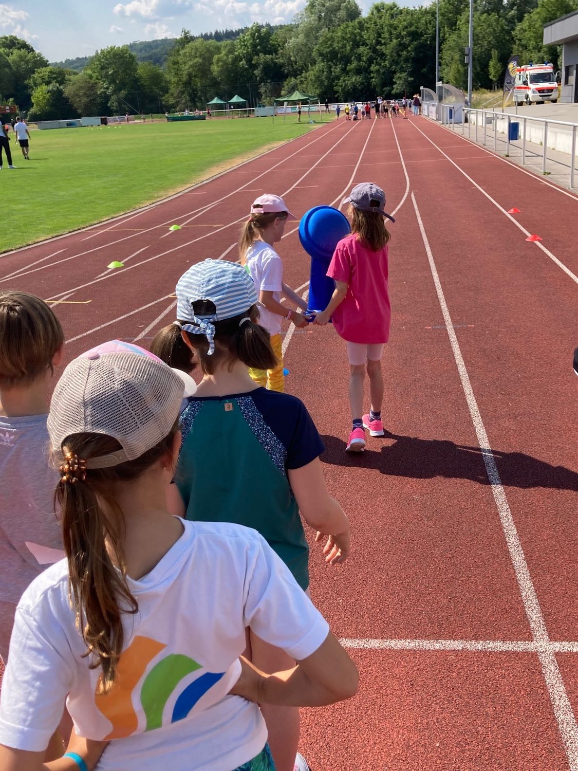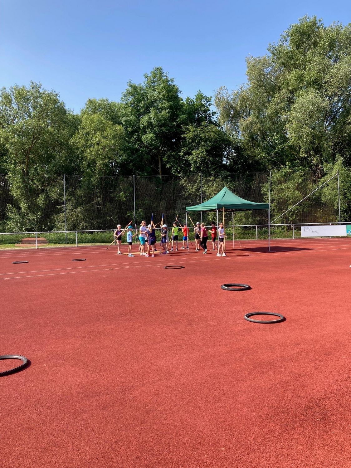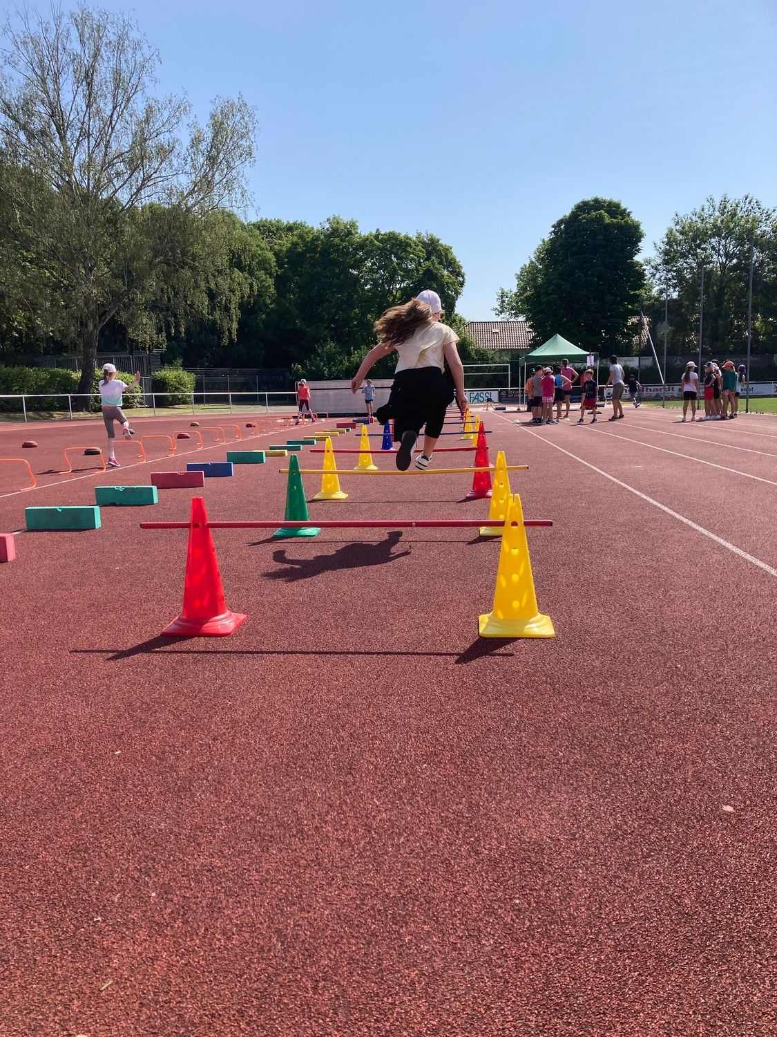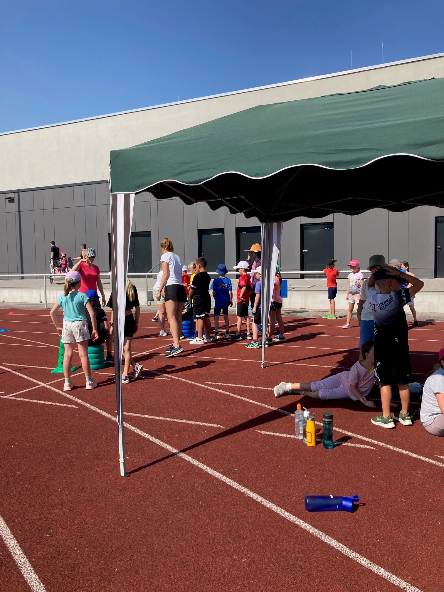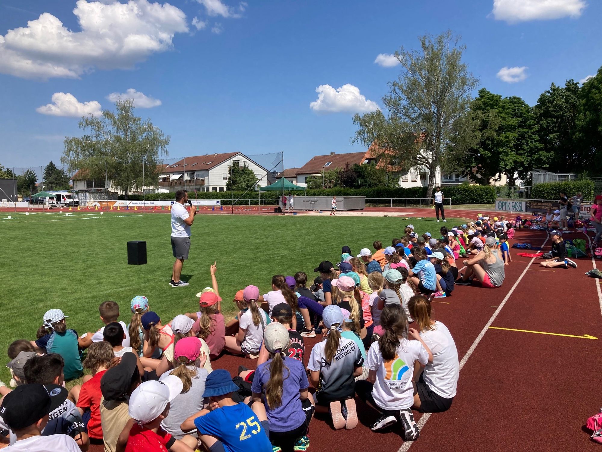 Um 8.30 Uhr trafen dann die knapp 180 Schüler:innen der Sophie-Scholl-Schule Leonberg ein und konnten es kaum erwarten, an den Stationen sprinten, werfen und springen zu dürfen. Nach einer gemeinsamen Erwärmung startete der Stationenbetrieb: an der Wurfstation flogen die Wurfgeräte und beim Sprint versuchten sich die Kinder gegenseitig zu übertrumpfen – sowohl in der Geschwindigkeit der Läufe als auch in der Kreativität, als es darum ging, verschiedene Startpositionen zu finden.