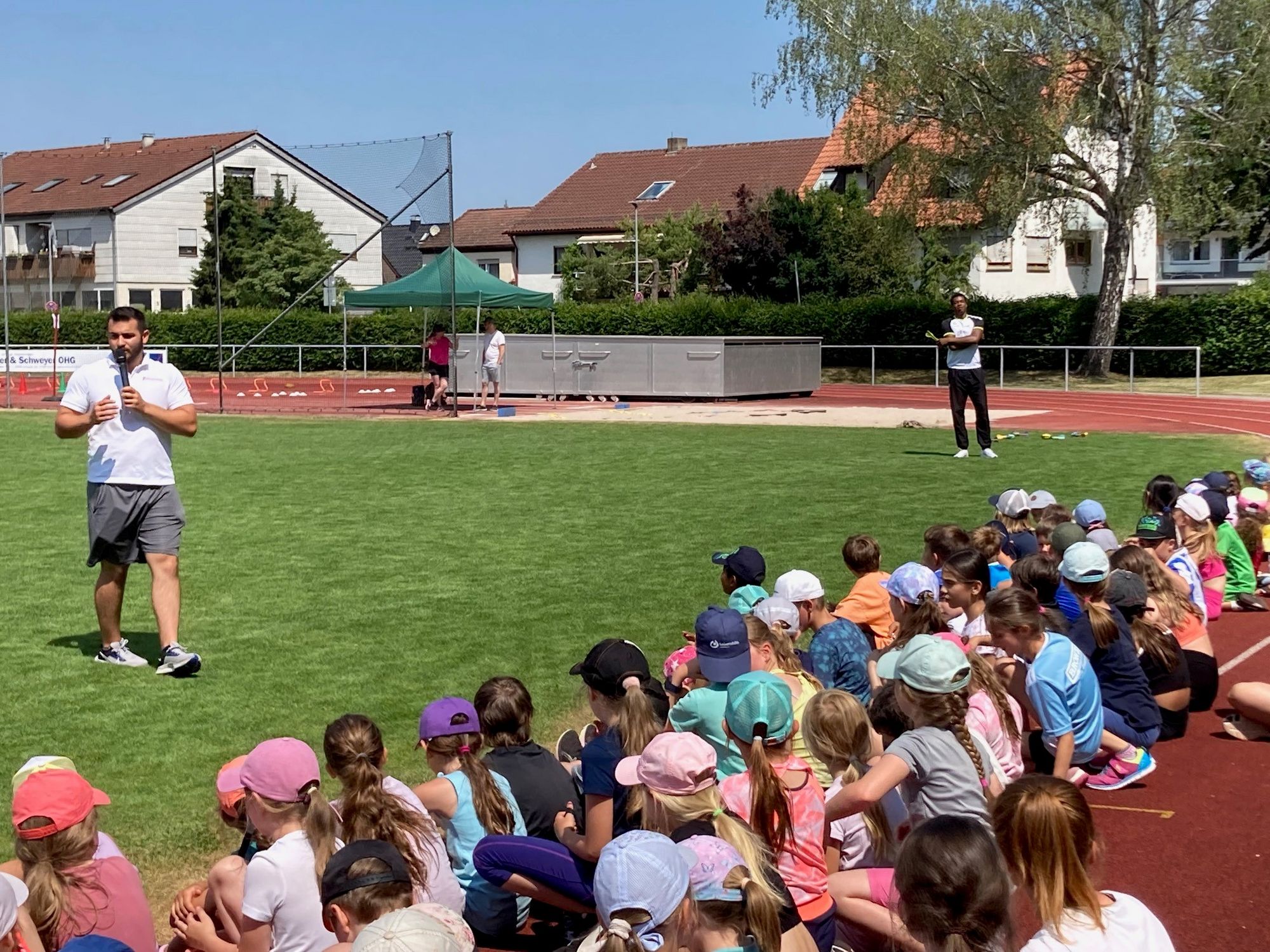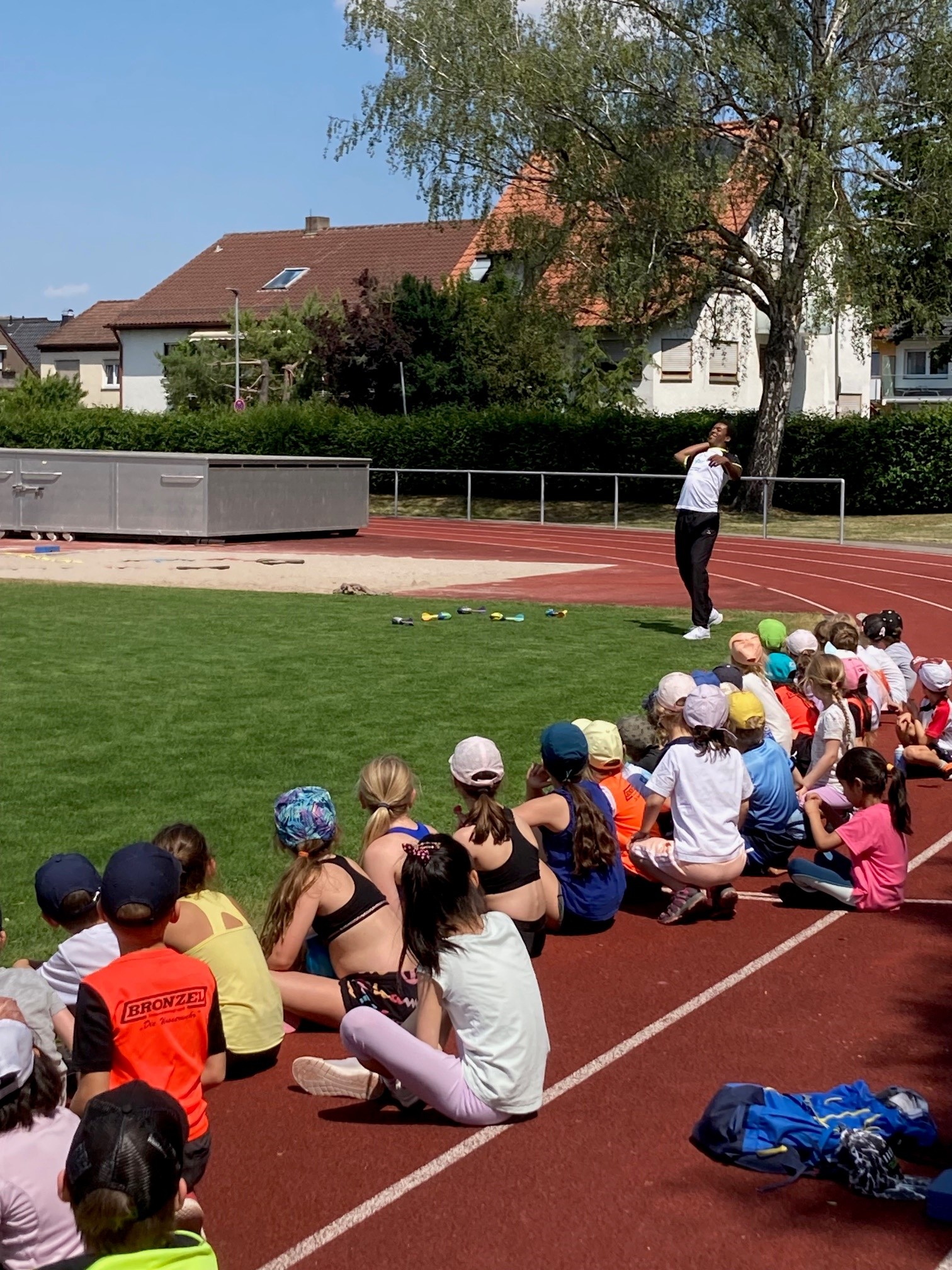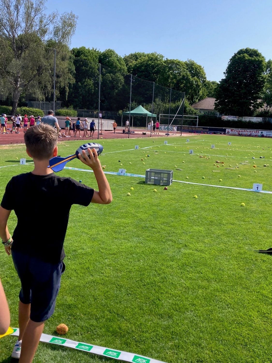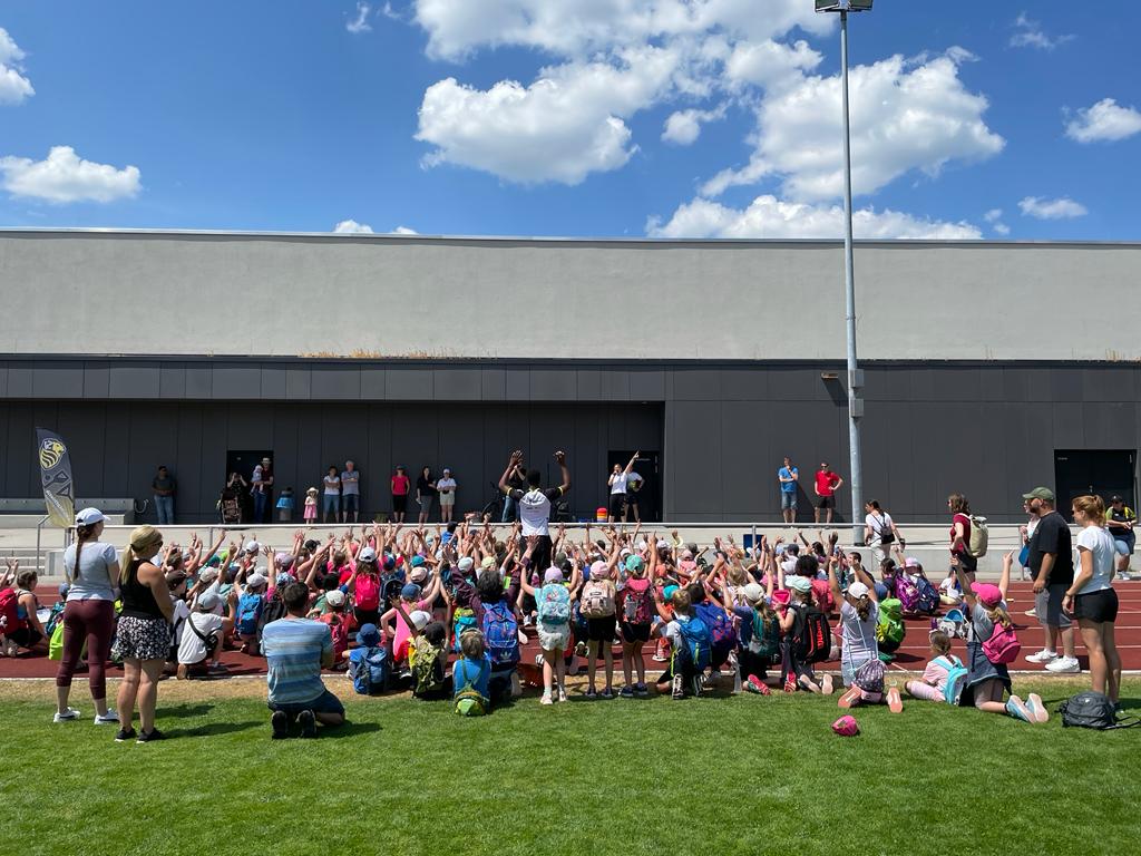 Nach der zweiten Pause gab es eine Wurfvorführung von Kelson De Carvalho (momentan U18 Weltranglisten-Dritter in Diskus und Kugel; LG Steinlach-Zollern). Angefeuert von den Kids warf er den Heuler über den Sportplatz, so dass ihm die Bewunderung der Kinder sicher war. Während am Ende der Veranstaltung alle gemeinsam aufräumten, durfte Kelson alle 180 Urkunden der Schüler:innen persönlich signieren.