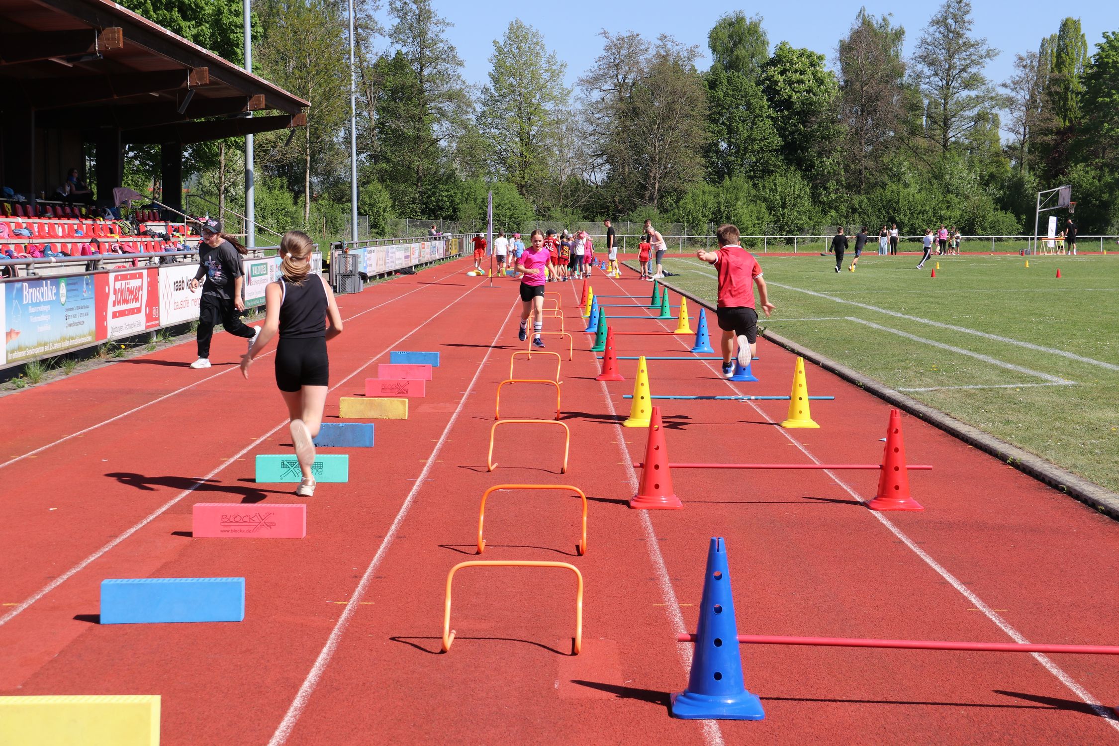 Bei strahlendem Sonnenschein wurde eine nach der anderen Station von den 13 Klassen durchlaufen und nicht nur einmal bekamen die Lehrkräfte, die Helfer:innen und das WLV-Team von den Kindern zu hören, dass die Stationen richtig viel Spaß machen. Ein besonderes Highlight für alle war die Weitsprung-Vorführung des TV Mengen. Athlet:innen von der U12 bis zur U20 sprangen um die Wette und wurden dabei lautstark von den Grundschulkindern angefeuert.