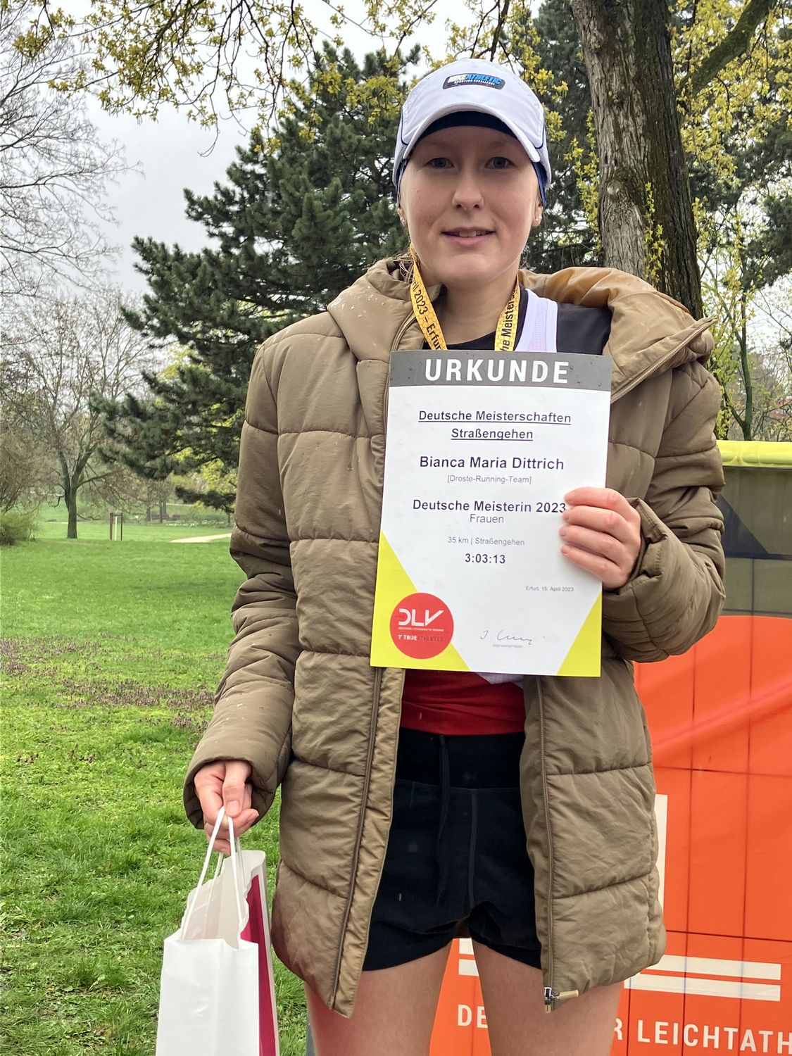 Deutsche Meisterin über die 35 Kilometer-Distanz wurde in herausragender Manier die für das Droste-Running-Team startende Bianca Maria Dittrich. Sie nahm der zweitplatzierten Berlinerin Katrin Schusters, welche im vergangenen Jahr an den Europameisterschaften in München teilnahm, mehr als elf Minuten ab und erreichte das Ziel nach 3:03:13 Stunden. Dabei ist der Gehsport für die 29-jährige Freiburgerin lediglich ein Hobby: In der dreiköpfigen Trainingsgruppe, die vom ehemaligen Weltklasse-Geher Robert Ihly geführt wird, ist sie die einzige Athletin ohne Kaderstatus. Sie arbeitet in Vollzeit in der IT-Branche, studiert daneben noch Psychotherapie im Fernstudium. Dank eines guten Zeitmanagements und viel Unterstützung durch die Familie und den Trainer gelang es ihr, sich innerhalb von fünf Monaten auf der 35 Kilometer-Distanz um satte neun Minuten zu verbessern. Zum Saisonbeginn war die Euphorie so groß, dass die nationalen Titelkämpfe sogar bereits ihr dritter Auftritt innerhalb von fünf Wochen über die Langstrecke waren. Drei Wochen vor dem Gewinn des Meistertitels stellte sie in der Slowakei eine neue deutsche Bestleistung mit 3:00:57 Stunden auf.