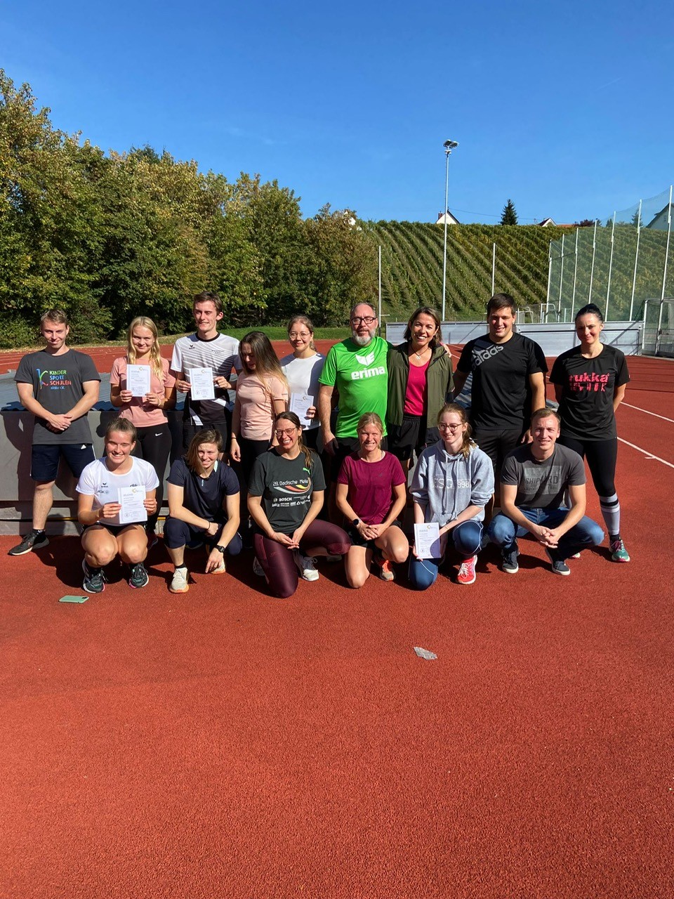 Im Laufe der Woche legten alle Teilnehmenden zwei theoretische Prüfungen und eine praktische Lehrprobe ab. Am Freitag Mittag hielten schließlich sechzehn neue Trainerinnen und Trainer ihre wohlverdienten Trainerscheine freudenstrahlend in den Händen und können es nun kaum erwarten, das Gelernte mit unseren jüngsten Leichtathleten erneut in die Praxis umzusetzen.